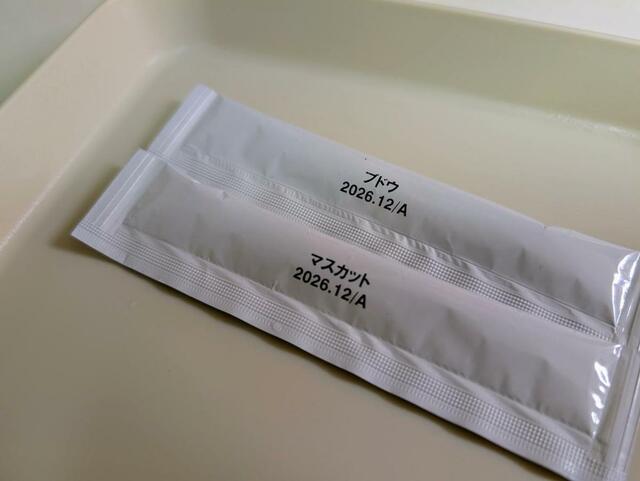 味はマスカット、ライチ、レモン、ぶどう、りんごの5種類。賞味期限は18ヶ月で、パッケージに印字されています。