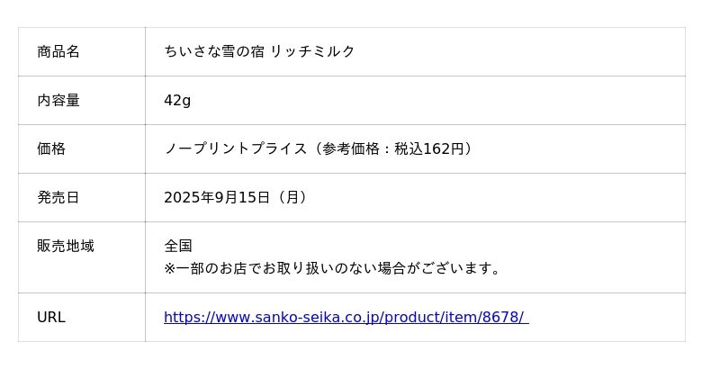 三幸製菓株式会社は、「42g ちいさな雪の宿 リッチミルク」を、2025年9月15日(月)から全国で発売いたします。