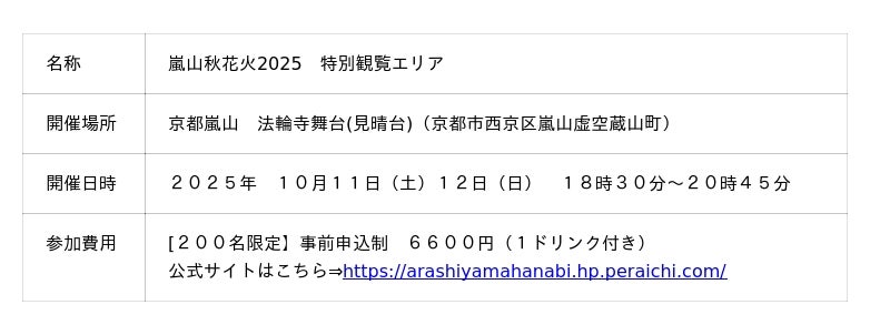 嵐山秋花火2025特別観覧エリア-2025年10月11日(土)12日(日)18時30分~20時45分【先着200名様限定】法輪寺展望台からの貸切観覧エリアを開催します。