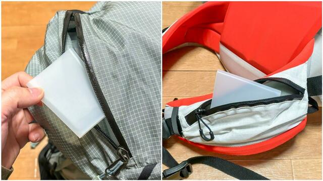 これだけ薄いと、衣類のポケットやリュックのウエストハーネスに付いているポケットなどに収納することができます。