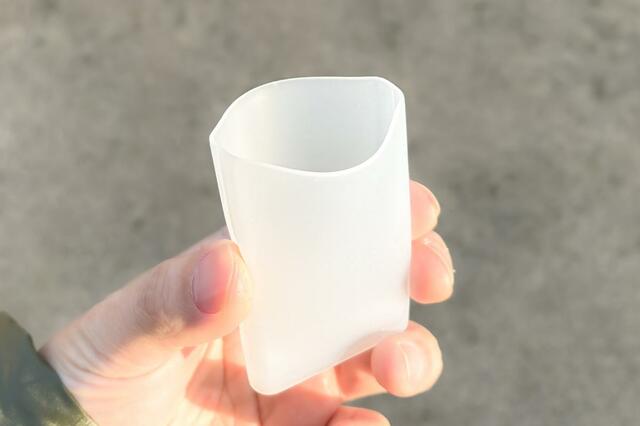 カードサイズでコンパクトな、シリコーンゴム製のコップです。