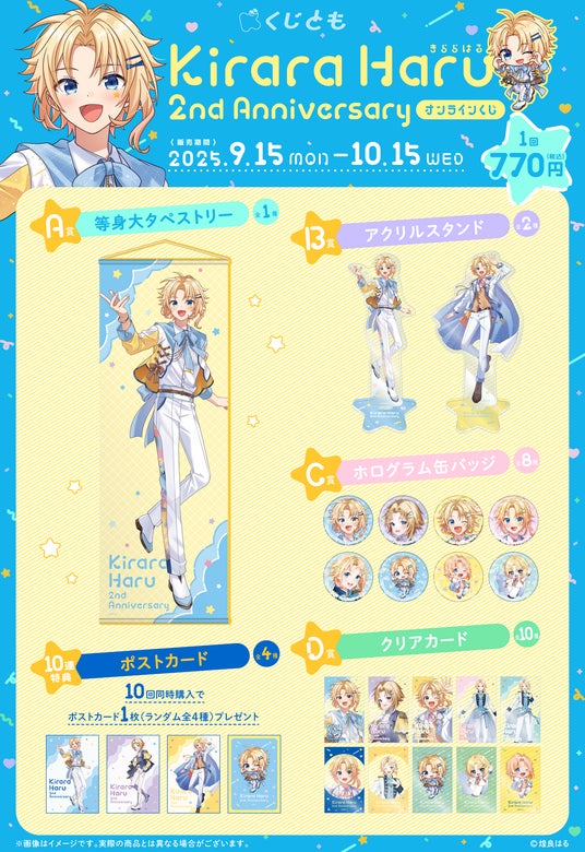 株式会社ブリッジ(本社:東京都千代田区 代表取締役社長:加藤 勝)は、運営するオンラインくじサービス「くじとも」より、2.5次元アイドルVtuber 煌良はる オンラインくじを、2025年9月15日(月)22時より販売します。
