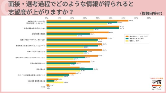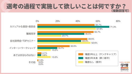 選考過程で企業に実施して欲しいことについて聞いたところ(複数回答可)、「カジュアルな面談・座談会」がトップでした。職歴別に見ると、社会人経験3年以上のヤングキャリアは「カジュアル面談」56.7%、「職場見学」55.7%、「会社説明会・TOPセミナー」49.5%の順。社会人経験3年未満の第二新卒は「カジュアルな面談」が71.3%と突出し、「職場見学」46.5%、「会社説明会・TOPセミナー」43.3%が続きます。職歴なしの既卒者は、「カジュアルな面談」57.9%、「会社説明会・TOPセミナー」52.6%が多く、3位の「職場見学」は23.7%にとどまりました。職務経験の有無や長さによって、企業に求めることが異なる傾向があることが分かります。