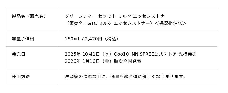 『グリーンティー セラミド ミルク エッセンストナー』を2025年10月1日(水)よりQoo10 INNISFREE公式ストアにて先行発売、2026年1月16日(金)より順次全国発売、 『グリーンティー セラミド バリア クリーム』を2025年10月1日(水)より順次全国発売いたします。
