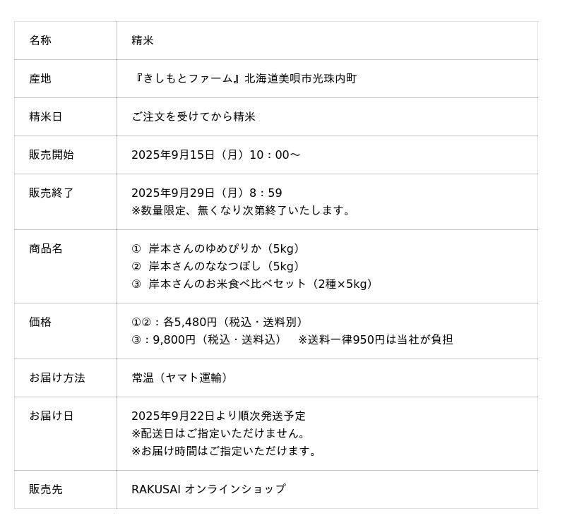 楽彩株式会社(本社:東京都足立区/代表取締役社長:大崎善保)は、改めて美味しいお米を求める声が高まる中、北海道の豊かな大地で育った、きしもとファームの特別栽培米『ゆめぴりか』と『ななつぼし』を、2025年9月15日(月)10:00より公式オンラインショップにて販売開始いたしました。
