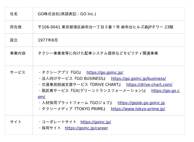 GO株式会社は、「移動で人を幸せに。」をミッションに掲げ、モビリティ領域を軸とする多様な事業・サービスを展開しています。協働パートナーの皆さまとの共創力と、テクノロジーを最大限に活用する開発体制のもと、時代に合わせた「移動」のアップデートを通じて、日本の社会課題の解決を目指します。