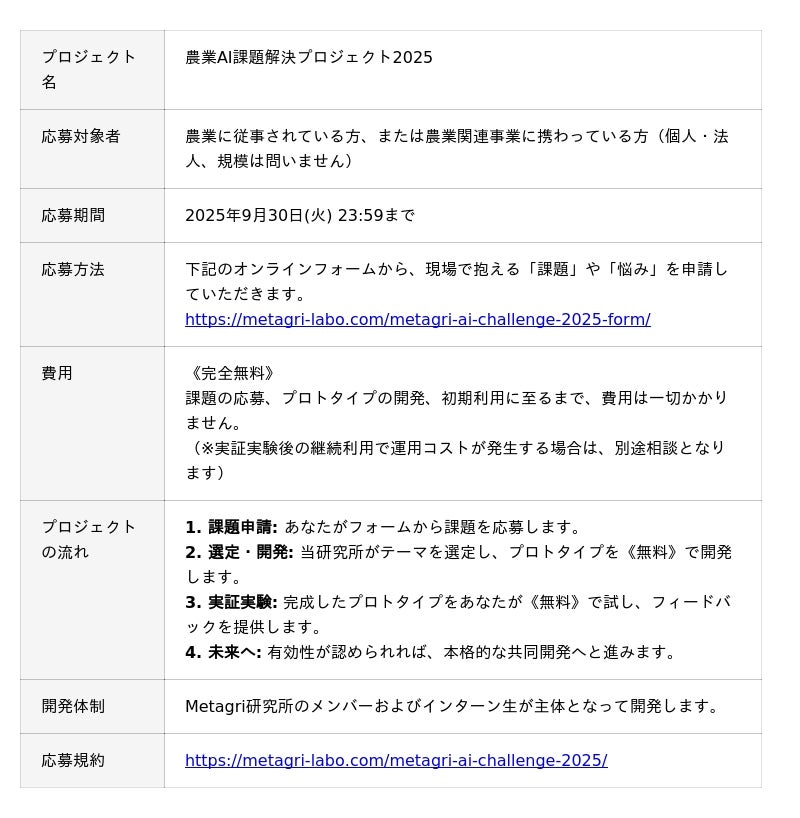 農業×新技術を推進するコミュニティ「Metagri研究所」(運営:株式会社農情人、本社:千葉県船橋市、代表取締役:甲斐雄一郎)は、日本の農業が直面する課題に対し、生成AIを活用して解決策を共創する新プロジェクト「農業AI課題解決プロジェクト2025」を始動したことをお知らせします。本プロジェクトでは、農家から応募された現場の課題に対し、当研究所が選定の上、解決策となるプロトタイプを《開発費無料》で制作し、応募者に《初期費用無料》で提供します。