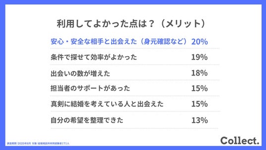 メリットとして挙げられたのは「安心・安全な相手と出会えた(20%)」を筆頭に、「条件で探せて効率がよかった(19%)」や「出会いの数が増えた(18%)」が続きました。結婚に繋がる良質な出会いの場を提供していることが評価されているようです。