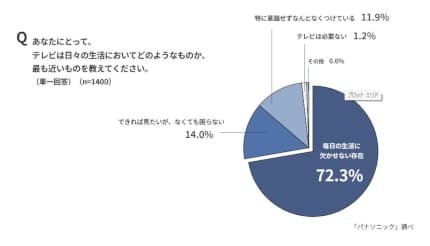 調査対象者に、テレビは日々の生活においてどのようなものかを尋ねたところ、「毎日の生活に欠かせない存在」(72.3%)を挙げる回答がもっとも多かった。