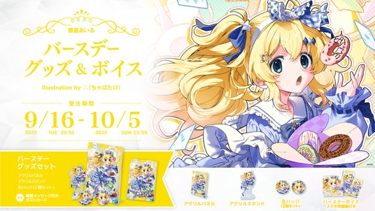 本日・9月16日に誕生日を迎えた雛星あいるのバースデーグッズの詳細を公開するとともに、公式オンラインショップ「VEE Official Shop」にて受注販売を開始しました。