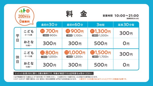 ・上記料金は、子育て応援アプリ「トットット」に会員登録された方の会員価格です。入場当日にご登録いただいた場合も、当日から会員料金が適応されます。