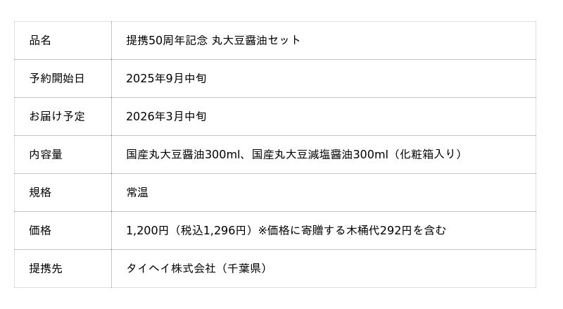 生活クラブ事業連合生活協同組合連合会(本部:東京都新宿区、会長 村上彰一、以下生活クラブ)は、生産者・タイヘイ株式会社との提携50周年を記念し、木桶仕込みで自然垂れ製法といった伝統的な技術を活かした数量限定品「提携50周年記念丸大豆醤油セット」の予約受付を9月中旬から開始します。本セットは、国産原料で仕込んだ限定12,000セットで、丸大豆醬油300mlと減塩醬油300mlの2本入りです。