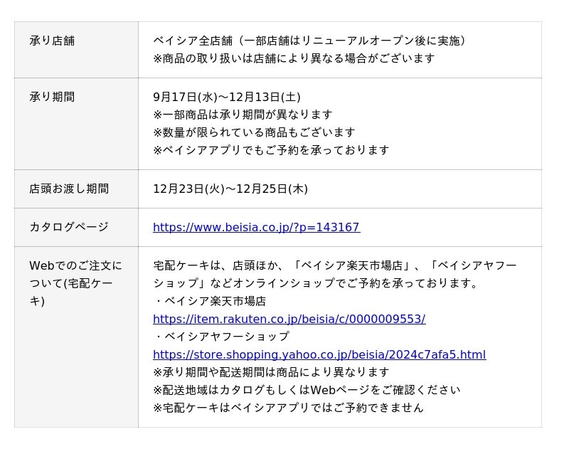 株式会社ベイシア(本社:群馬県前橋市、代表取締役社長:相木孝仁)は、9月17日(水)より2025年のクリスマスケーキ・パーティーメニューの予約を開始しました。昨年に引き続きベイシアのプライベートブランド商品「別海のおいしい牛乳」を使用したチーズケーキが登場します。さらに、ベイシアオリジナルのケーキに加え、有名パティスリー監修の華やかなケーキも多数ご用意。お子さまから大人まで、幅広い世代に喜ばれるバリエーション豊かなラインナップが揃いました。また、クリスマスパーティーをより一層盛り上げるオードブルやお寿司・お肉などのごちそうを、シーンに合わせて組み合わせたおすすめのコースメニューも充実。ご家族やご友人、大切な方との特別なひとときを、ベイシアのクリスマスメニューでお楽しみください。