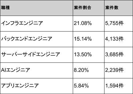 2025年9月時点のPython案件の職種は、インフラエンジニアが21.08%(5,755件)で最多、次いでバックエンドエンジニアが15.14%(4,133件)、サーバーサイドエンジニアが13.50%(3,685件)、AIエンジニアが8.20%(2,239件)、アプリエンジニアが5.84%(1,594件)です。