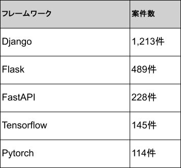 2025年9月時点のPythonフレームワーク別案件数では、Djangoが1,213件で1位、2位はFlaskが489件、3位はFastAPIが228件、4位はTensorFlowが145件、5位はPyTorchが114件です。