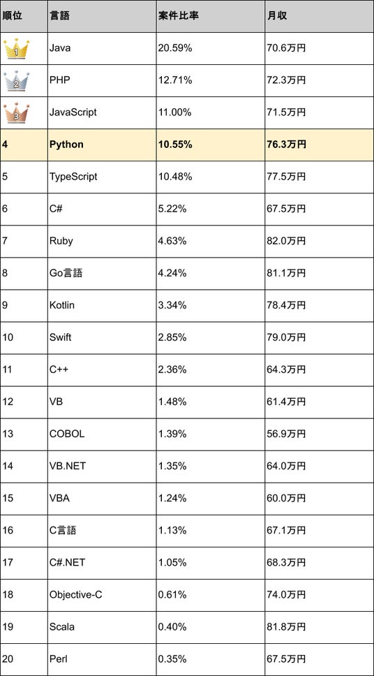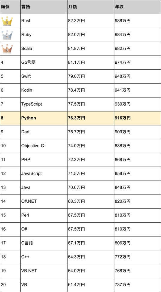 Python案件の平均月額単価は76.3万円、平均年収は916万円で、年収ランキングでは8位に位置しています。