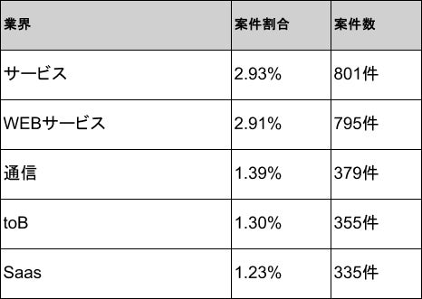 2025年9月時点のPython案件は、サービスが2.93%(801件)で1位、WEBサービスが2.91%(795件)で2位、通信が1.39%(379件)で3位、toBが1.30%(355件)で4位、SaaSが1.23%(335件)で5位となり、上位5業界で全体の約9.8%を占めています。