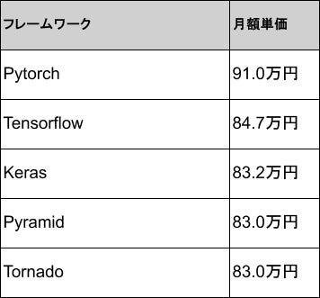 2025年9月時点のPythonフレームワーク別の月額単価は、1位がPyTorchで91.0万円、2位がTensorFlowで84.7万円、3位がKerasで83.2万円、4位がPyramidで83.0万円、5位がTornadoで83.0万円です。
