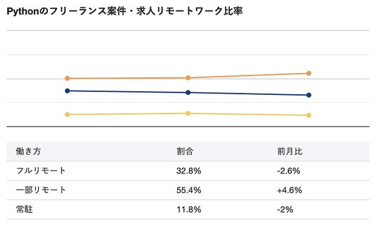 一部リモートが過半を占める理由は、Pythonがデータ分析や機械学習、API開発など職能横断的な協業を必要とし、日々の実験やレビューはリモートで十分行える一方、モデルの本番適用やデータガバナンス対応では対面での要件整理や社内環境へのアクセスが求められやすいためです。金融や医療など機密性の高い分野では、監査要件から常駐比率が一定程度残ります。