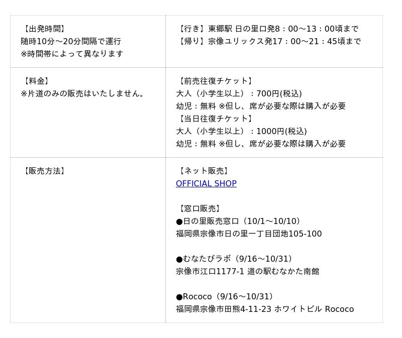 JR東郷駅日の里口から宗像ユリックスまでのシャトルバスも随時運行いたします。(有料)