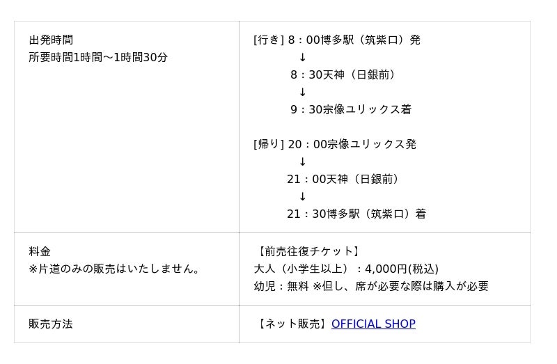 ●博多(筑紫口)・天神(日銀前)⇔宗像ユリックス※60席限定(うち11席は補助席)