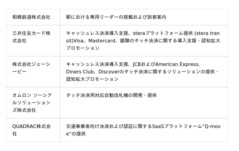相鉄グループの相模鉄道(株)(本社:横浜市西区、社長・千原 広司)、三井住友カード(株)(本社:東京都江東区、代表取締役 社長執行役員 CEO・大西 幸彦)、(株)ジェーシービー(本社:東京都港区、代表取締役会長兼執行役員社長・二重 孝好)、オムロン ソーシアルソリューションズ(株)(本社:東京都港区、代表取締役社長・四方 克弘)、QUADRAC(株)(本社:東京都中央区、代表取締役社長・高田 昌幸)は、三井住友カードの公共交通機関向けソリューション「stera(ステラ) transit(トランジット)」を活用したクレジットカードなど(※1)のタッチ決済サービスを、2026年春(予定)(※2)から相鉄線全線で順次開始します。