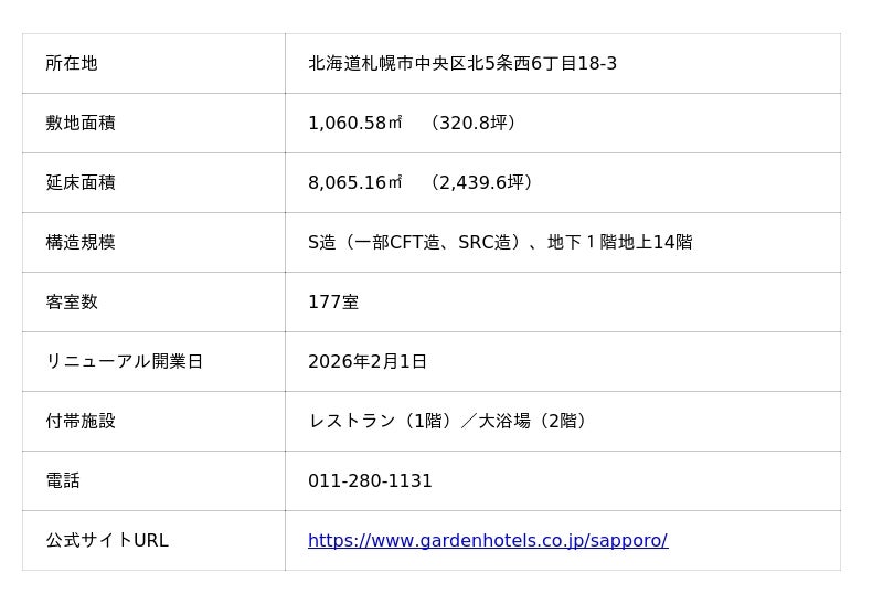 三井不動産株式会社(本社:東京都中央区、代表取締役社長:植田 俊)および株式会社三井不動産ホテルマネジメント(本社:東京都中央区、代表取締役社長:杉山 亮)は、「三井ガーデンホテル札幌」(所在:北海道札幌市)のリニューアル工事を実施しておりますが、2025年10月20日(月)より全館休館し、2026年2月1日(日)にリニューアルオープンすることを決定いたしました。宿泊予約の受付は、2025年9月17日(水)に開始いたします。