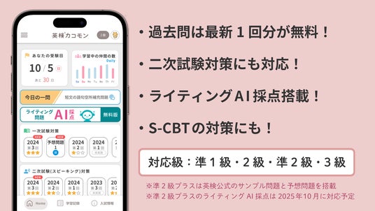 教育出版社の株式会社旺文社(東京都新宿区、代表取締役社長 粂川 秀樹)は、2025年9月17日より、実用英語技能検定(以下、英検)の過去問学習ができるwebサービス「受験生のための英検(R)カコモン」(準1級~3級対応 ※1)に、新たに2024年度第3回の過去問を搭載しました。無料公開中のライティングAI採点で、AIによるライティング解答の採点・添削が可能です。