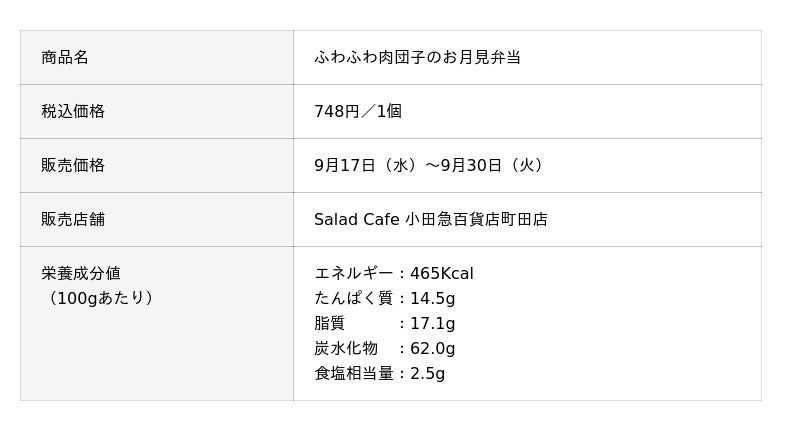 サラダカフェ株式会社は、9月17日(水)より、小田急百貨店町田店で開催される「秋のフードフェス」企画にあわせ、期間限定で秋の風物詩”お月見”をテーマにした「ふわふわ肉だんごのお月見弁当」を発売します。