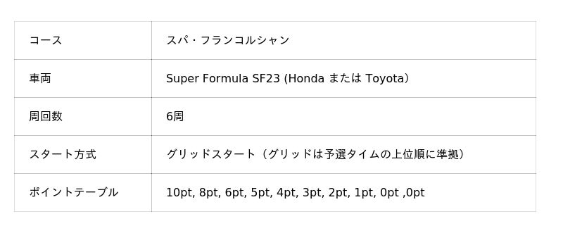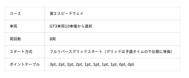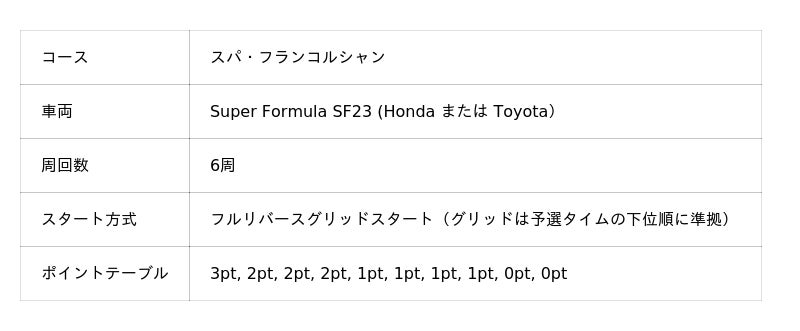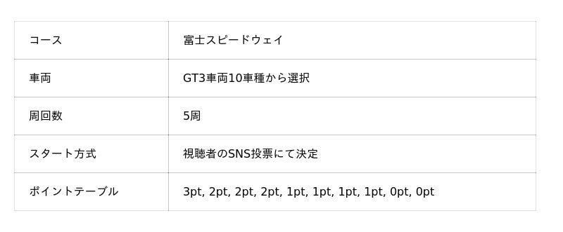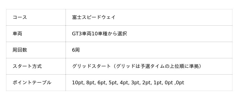 本レースはエキシビションマッチの位置付として実施し、ポイントは計上されません。バーチャルでしかできない、eモータースポーツならではのレースをコンセプトに、Super Formula SF23とGT3の混走レースを実施します。各チーム2名が出走し、10台による8周のスプリントレースを実施します。
