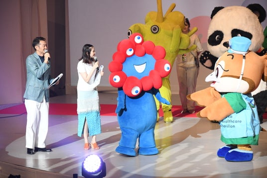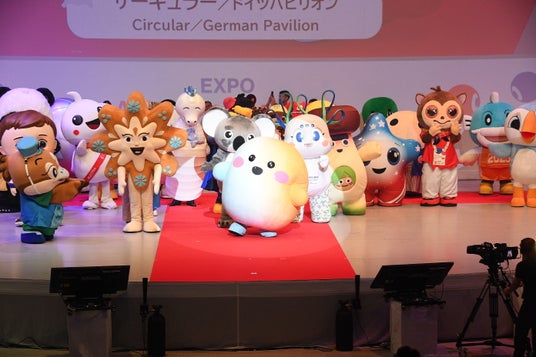 その後、大阪・関西万博公式キャラクター ミャクミャクと大阪ヘルスケアパビリオンのマスコットキャラクター もずやんが呼びかけ、各パビリオンや、大阪府内の市町村から駆けつけてくれた総勢46体のキャラクターが大集合。個性あふれるキャラクターたちがステージ上を元気いっぱいに練り歩き、DJ Hello Kittyによるスペシャルパフォーマンスで会場は熱気に包まれました。最後にはキャラクター人気投票の結果が発表され、見事1位に輝いたドイツパビリオンの「サーキュラー」に大きな拍手が送られました。