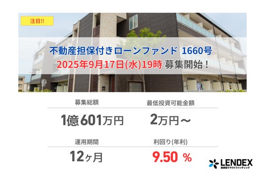 この度、融資型クラウドファンディング「レンデックス(LENDEX)」を運営する株式会社LENDEX(本社:東京都渋谷区、代表取締役:中村 智)は、不動産担保付きローンファンド1660号を本日、2025年9月17日の19時に募集開始することをお知らせします。