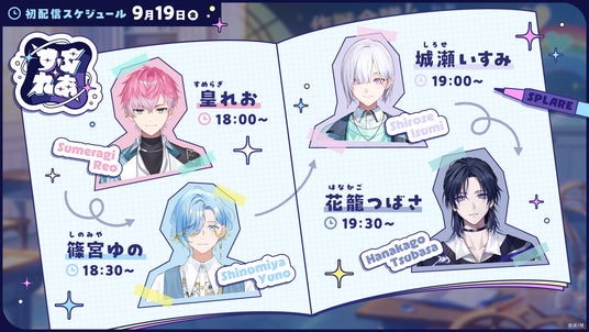 YouTubeでの初配信は各ライバーのチャンネルにて、2025年9月19日(金)18:00よりリレー形式で行います。「すぷれあ」メンバーの初配信をぜひお楽しみください。