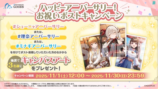 アニバーサリー月の11月には、アクアプラス公式X(@AQUAPLUS_JP)での抽選プレゼントキャンペーンや、「AQUAPLUS official members club」会員限定の壁紙プレゼントも予定しています。