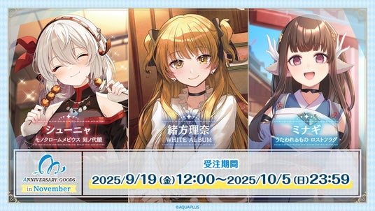 株式会社HIKE(本社:東京都新宿区、代表:三上 政高)は、株式会社アクアプラスの作品に登場するキャラクターの誕生日や記念日をお祝いするプロジェクト「AQUAPLUSアニバーサリーグッズ」第5弾として、11月に記念日を迎える「シューニャ」(ゲームリリース記念日:11月17日、『モノクロームメビウス 刻ノ代贖』)、「緒方理奈」(誕生日:11月26日、『WHITE ALBUM』)、「ミナギ」(ゲームリリース記念日:11月26日、『うたわれるもの ロストフラグ』)のグッズを2025年9月19日(金)12時より販売いたします。また、数多くのキャラクタープリントケーキを販売している「プリロール」(運営:株式会社栄通)より、アニバーサリーケーキが販売されることもあわせてお知らせいたします。