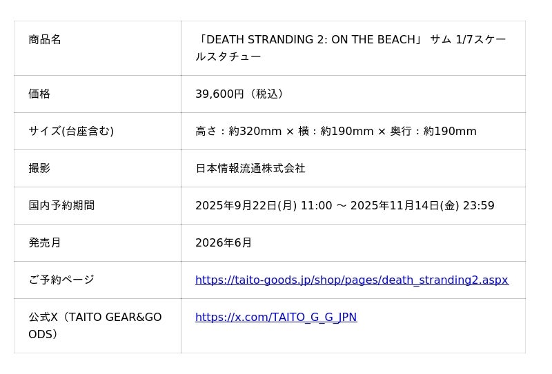 株式会社タイトー(本社:東京都新宿区、以下タイトー)は、新ブランド「GEN PRODUCTS(ゲンプロダクツ)」から、ローンチアイテムとして、『DEATH STRANDING 2: ON THE BEACH』より「サム 1/7スケールスタチュー」を発売いたします。2025年9月22日(月)11:00より、ECサイト「TAITO GEAR&GOODS」(URL:https://taito-goods.jp/shop/default.aspx)にて予約受付を開始します。