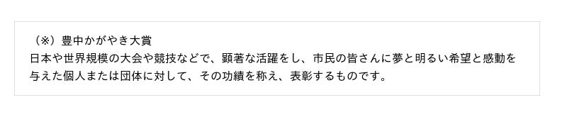 この快挙を賞して、長内繁樹豊中市長から、「豊中かがやき大賞」(※)を贈ります。