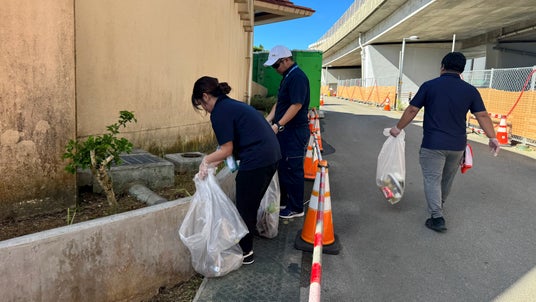 当日は天候にも恵まれ、まつり実行委員や沖縄市内の団体、地域の皆さまと交流を図りながら、会場となったコザ運動公園や沖縄サントリーアリーナ周辺の美化活動を行いました。まつり期間中、多くの来場者で賑わった会場のゴミを拾い集め、丁寧にゴミの分別まで行いました。