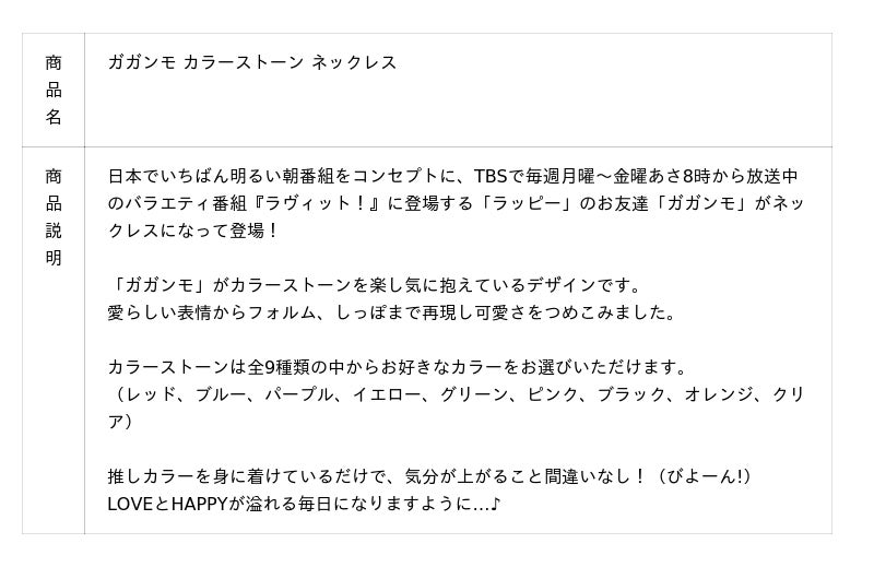 このたびの新作は、TBSの人気番組『ラヴィット!』の公式マスコットキャラクター「ガガンモ」を立体で再現したネックレスです。ガガンモがカラーストーンを楽し気に抱えているデザインで、カラーストーンは全9種類の中からお選びいただけます。