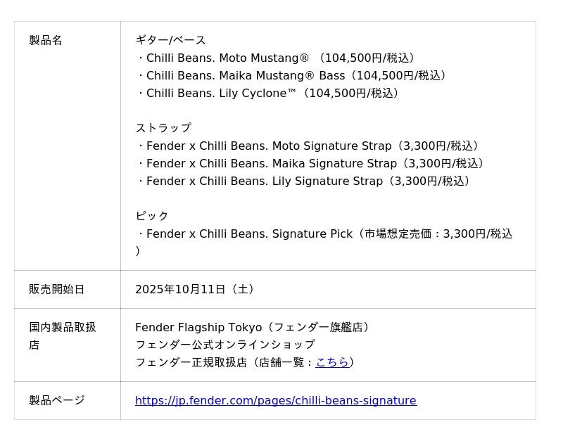 フェンダーミュージック株式会社(所在地:東京都渋谷区、代表取締役社長アジアパシフィック統括 エドワード・コール)は、次世代のポップロックシーンを牽引する3ピースバンド Chilli Beans. のメンバー、Moto(Vo)、Maika(Ba&Vo)、Lily(Gt&Vo)のシグネイチャーモデル3機種(ギター/ベース)およびストラップとピックを2025年10月11日(土)に発売します。