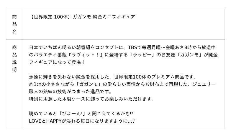 このたびの新作は、TBSの人気番組『ラヴィット!』の公式マスコットキャラクター「ガガンモ」を、永遠に輝きを失わない純金を採用しフィギュアにて再現しました。ジュエリー職人が熟練の技術で細部までこだわった逸品です。