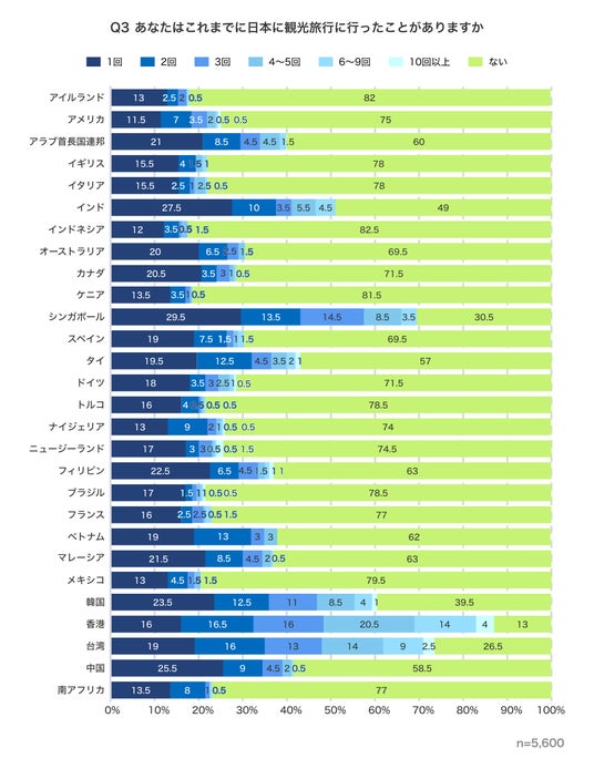 訪日経験ありの国TOP3は香港・台湾・シンガポール。香港では訪日4回以上のリピーターが4割弱
