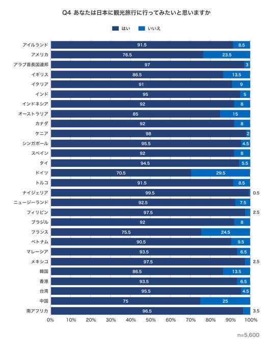 日本に観光旅行に行ってみたいと思うかを聞いたところ、『はい』の回答が9割を超えた国は、28カ国中、21カ国と大半を占めました。その中でも、「ナイジェリア」(99.5%)、「ケニア」(98%)、「フィリピン」(97.5%)、「メキシコ」(97.5%)、「アラブ首長国連邦」(97%)はほぼ100%に近い結果でした。全ての国で7割を超える回答者が『はい』と答えており、日本観光への関心の高さが明らかになりました。