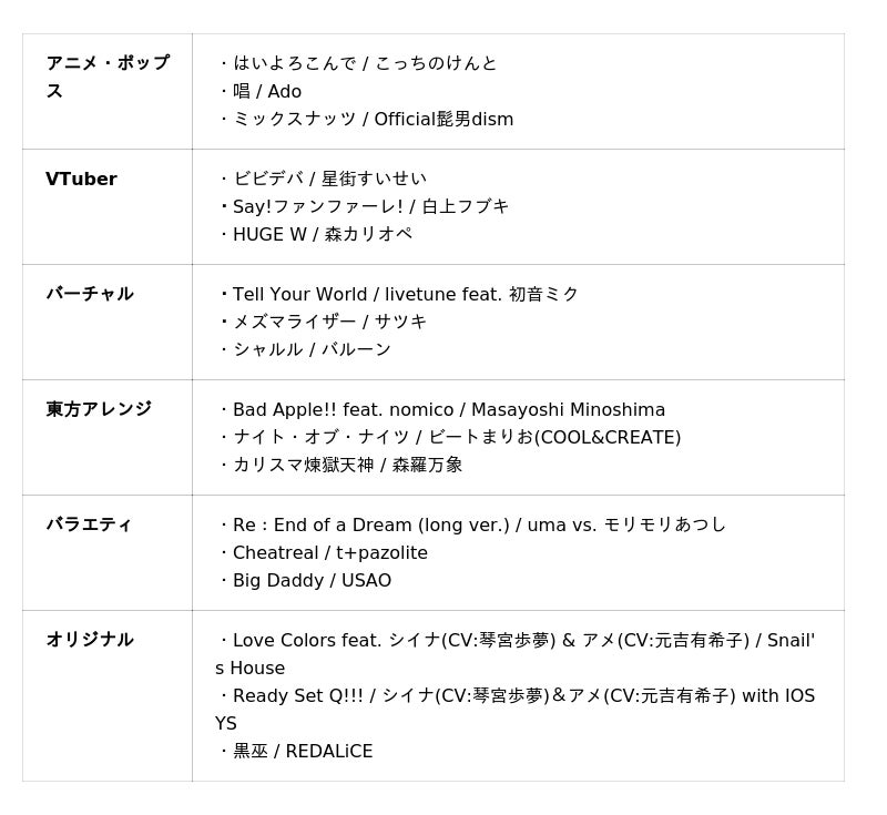 バブルシューティングを得意とするタイトーが手掛ける音楽ゲームの要素を加えた対戦パズルゲームで、完全オリジナル作品です。直感的に楽しめるバブルシューティングと、音楽に合わせてボタンを押すだけの音楽ゲームをミックスした、誰でもテンションバク上がりで楽しめるリズミカルパズルゲームです。遊べるモードは3種類あり、1人でも2人でも、オンライン・オフラインで対戦や協力バトルが楽しめます。アニメ・ポップス、VTuber、バーチャルシンガー、東方アレンジ、オリジナルなど、人気曲を全56曲収録しています。さらに、有償追加のダウンロードコンテンツも続々登場予定です。■本体収録曲(全56曲より一部)