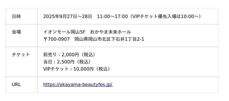 医療用品メーカーのダイヤ工業株式会社(本社:岡山県岡山市 代表取締役:松尾浩紀)は、2025年9月27日、28日におかやま未来ホールにて開催される岡山最大級の美容と健康のフェス「OKAYAMA BEAUTY FES 2025」に初出展いたします。当日は、理学療法士が運営するスタジオ「DAIYA からだラボ」の施術・ピラティス体験と、当社直営のサポーターショップ「ダイヤファクトリー」のサポーター、美容機器などの販売をいたします。