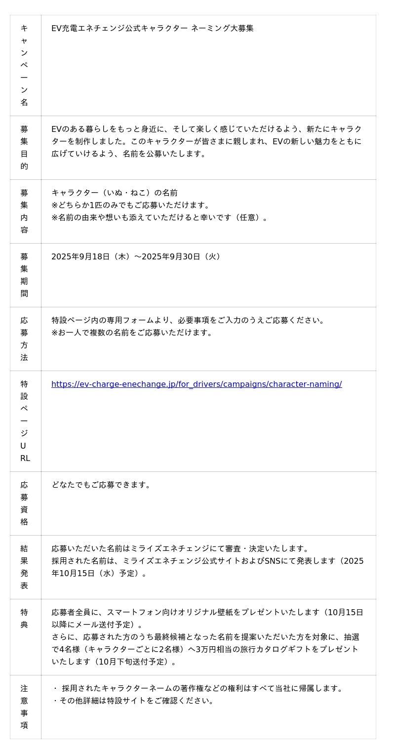 あわせて、本日よりキャラクターの名前を全国から募集するキャンペーン「EV充電エネチェンジ公式キャラクター ネーミング大募集」を開始いたします。ご応募いただいた方全員にスマートフォン用オリジナル壁紙をプレゼントし、さらに抽選で旅行カタログギフトが当たる特典もご用意しています。