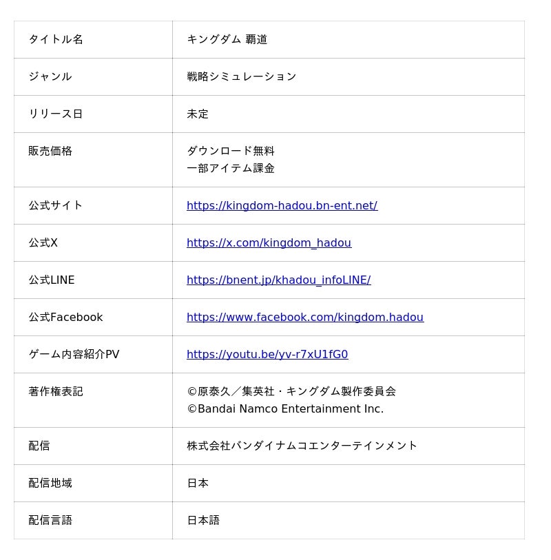 「キングダム 覇道」は、バンダイナムコエンターテインメントがコーエーテクモゲームスと共に開発中の戦略シミュレーションゲームです。