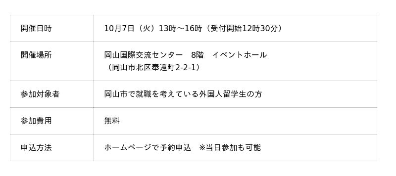 第二部(14:00~16:00)では、岡山市内に事業所があり、外国人材の採用意欲の高い企業(20社予定)との交流会を開催します。いろいろな業種や企業の採用担当者から、仕事内容や採用状況などの説明を聞くことができます。