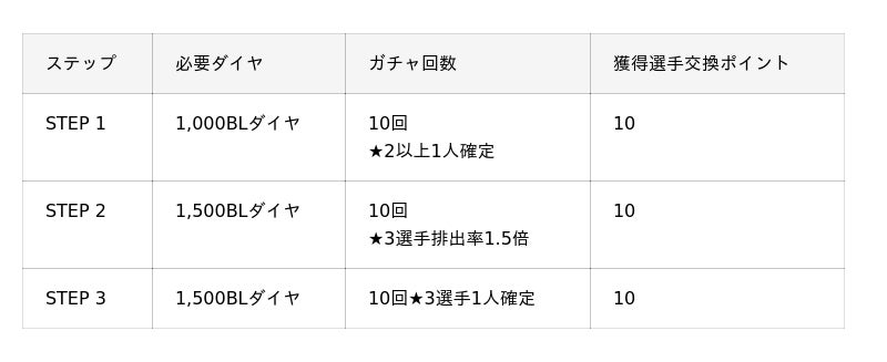 STEPを進めるごとに★3排出率が上昇し、今回はSTEP3で★3選手が1人確定となります。