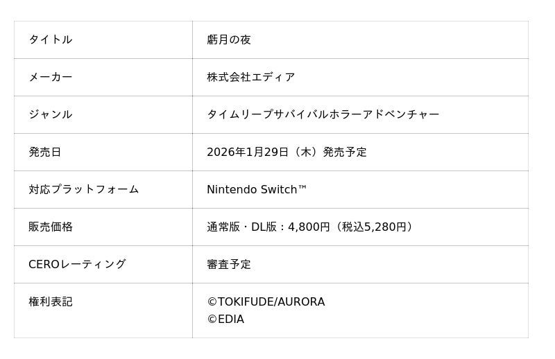 NSGグループの株式会社ガタケットは、株式会社エディア(本社:東京都千代田区、代表取締役社長:賀島 義成)と株式会社アウローラ(本社:埼玉県越谷市、代表取締役:森本浩二)と共同開発したNintendo Switch(TM)用ゲームソフト『虧月の夜(きげつのよる)』をリリースします。